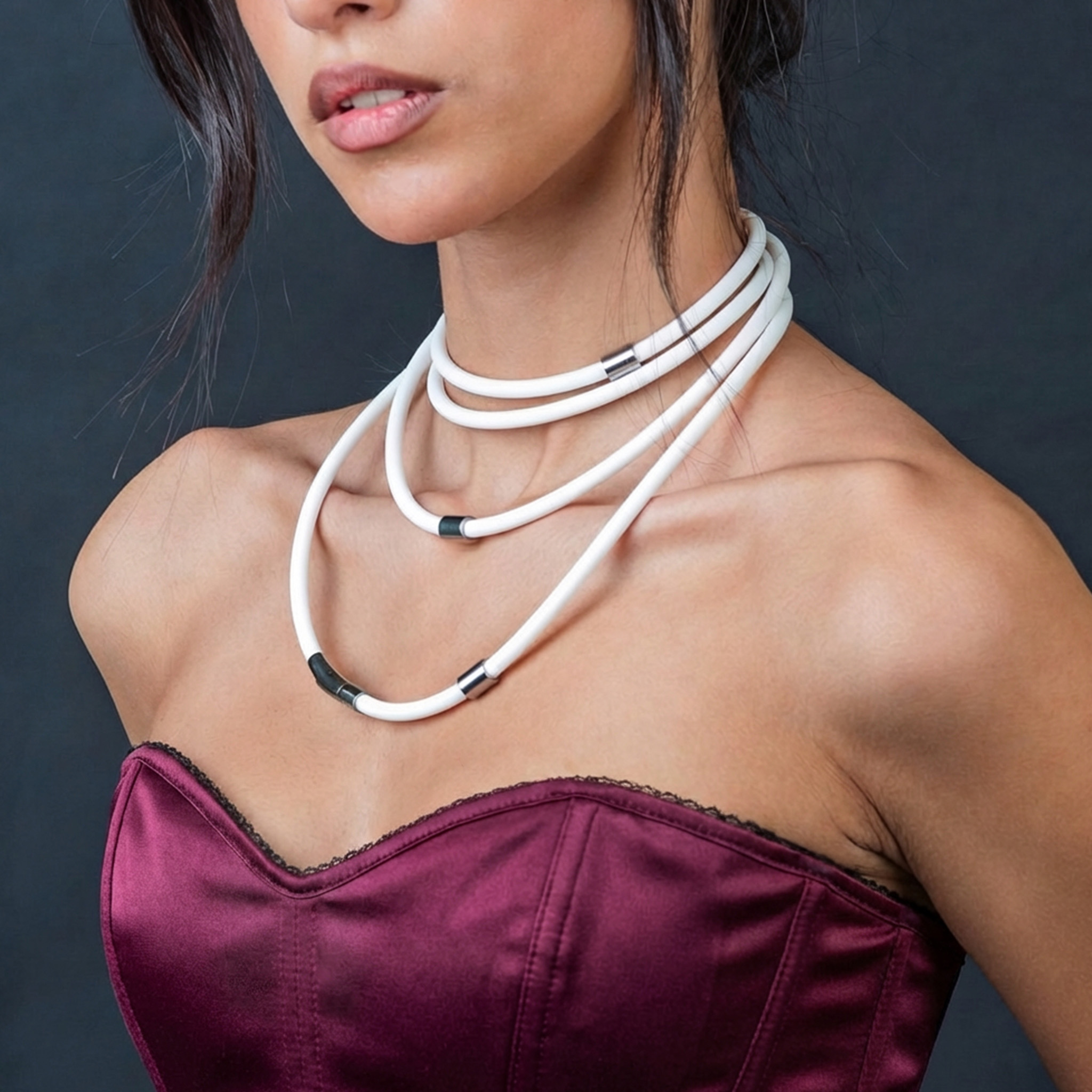 უმაღლესი ხარისხის სილიკონისგან დამზადებული ეს ქამარი მულტიფუნქციურია - შეგიძლიათ მოირგოთ როგორც სამაჯურად, ასევე ყელსაბამად. მეტალის დეტალები კი დამზადებულია უჯანგავი ფოლადისგან, რაც გამორიცხავს ფერის ცვალებადობას, არის წყალგამძლე და ჰიპოალერგიული.